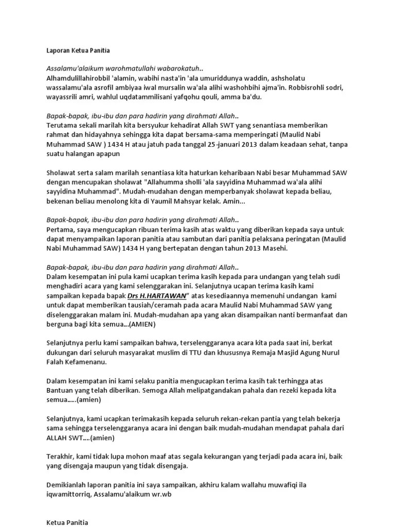 Beserta keluarga dan para sahabatnya sekalian. Sambutan ketua panitia acara maulid nabi muhammad saw. Sambutan ketua panitia kata sambutan merupakan salah satu agenda acara yang hampir selalu ada di setiap acara baik di lembaga formal maupun . Contoh kata sambutan acara tabligh akbar yang disampaikan oleh ketua panitia. Contoh pidato sambutan ketua muslimat dalam acara pengajian muslimat.